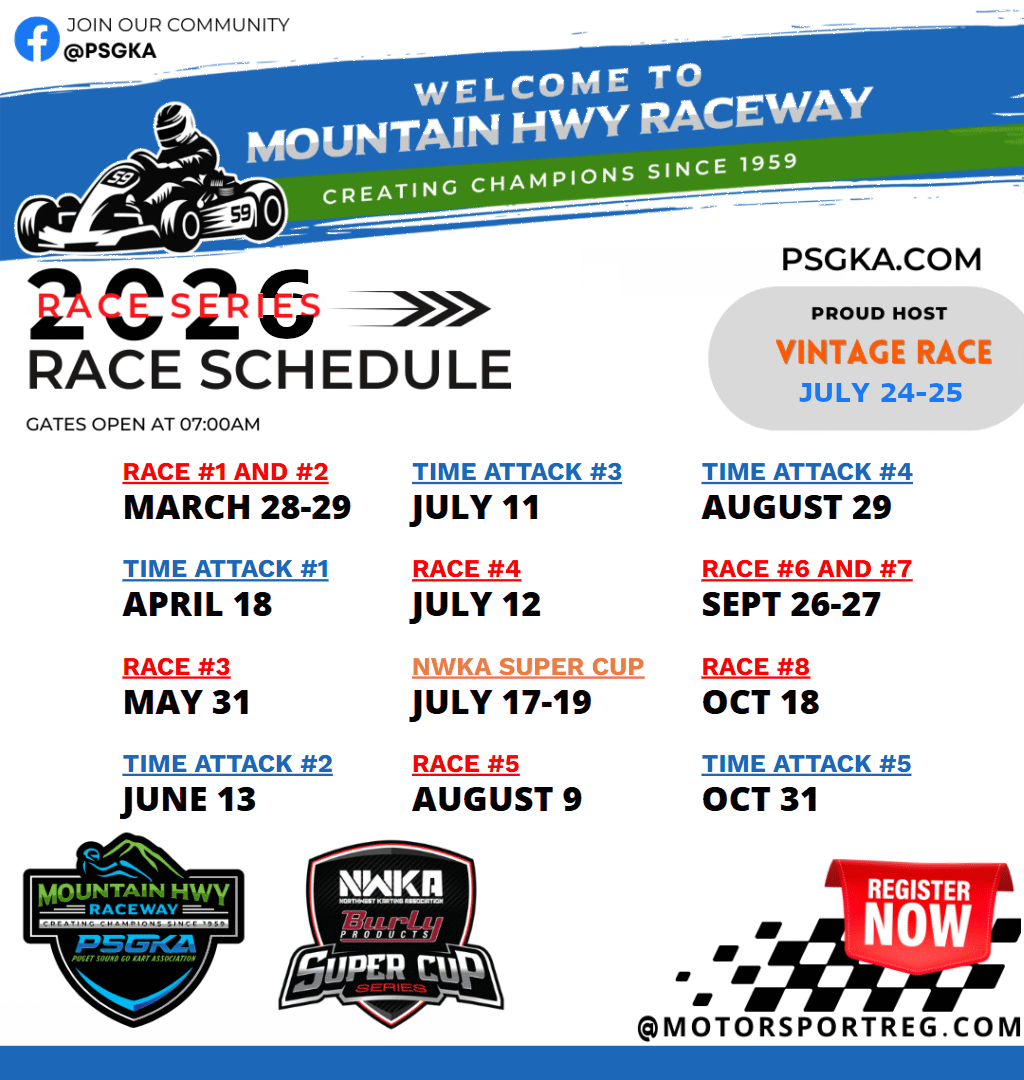 Puget Sound Go Karting Association (PSGKA) is a non-profit organization founded in 1959 in Spanaway, WA. We have over 100 member families with racers from 5 years to 50+ years old. Our sprint track is open year-round for kart owners and racers of all skill levels.