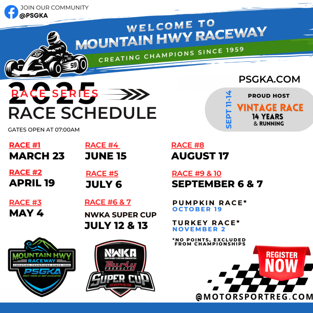 Puget Sound Go Karting Association (PSGKA) is a non-profit organization founded in 1959 in Spanaway, WA. We have over 100 member families with racers from 5 years to 50+ years old. Our sprint track is open year-round for kart owners and racers of all skill levels.